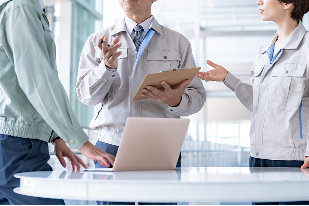 弊社ではチームワークを重視し、全スタッフが協力して高い成果を上げるための取り組みを行なっています。厳格な安全基準を守り、声かけによる安全管理を徹底することで、効率的に作業を進めています。また、メンバー間での意見交換や改善提案を奨励し、問題点や改善点を迅速に把握することで、チーム全体の品質向上に繋げています。特に新しいメンバーには、先輩スタッフがサポート役となり、仕事の進め方やチームの文化に早く馴染めるよう支援しています。